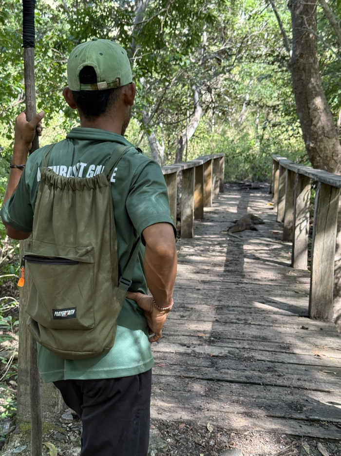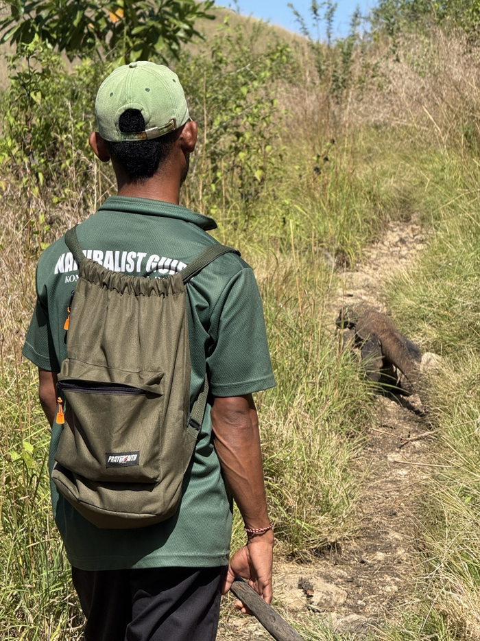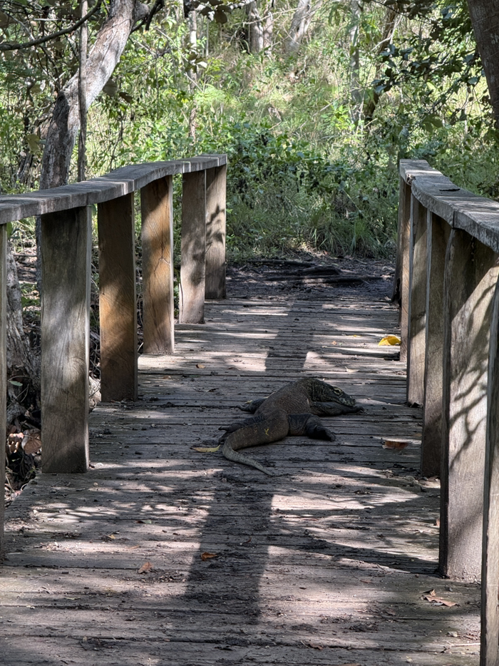 有趣的是,科莫多龙习惯于走直线,所以我们在后面走,它在前面爬,感觉跟遛狗似的走了好久。直到完全没有树荫遮挡的地方,它才勉强转了个小角度,爬到树丛里去了。