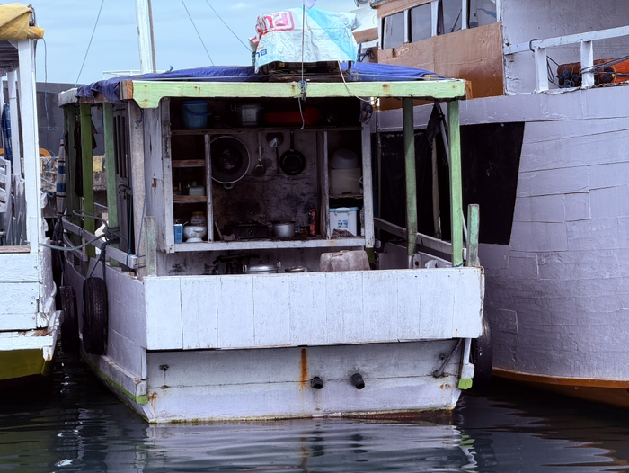 港口的另一个渔船上,已经把厨房搬上来了。