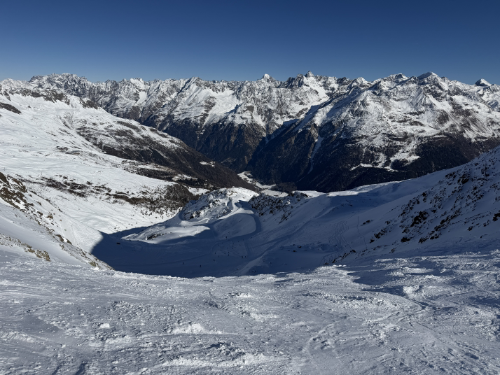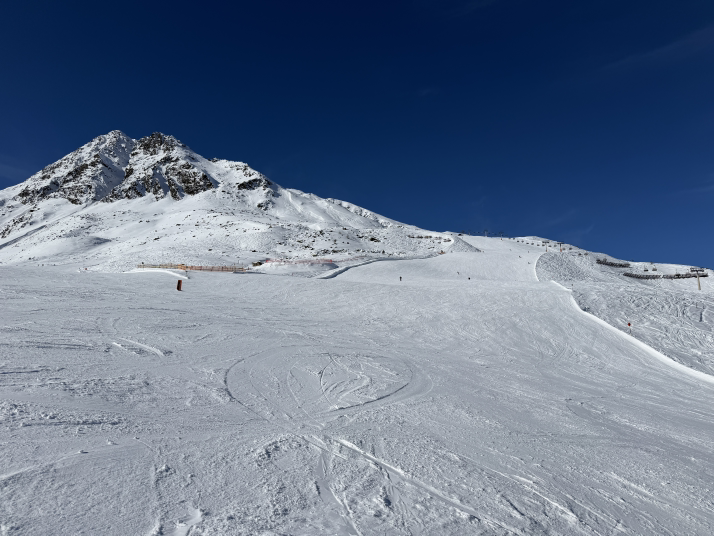 索尔登大致有三个山头,一个挨着镇中心,一个在侧边点,再有一个所谓的冰川区。然后这个侧边的山上的雪道是我有生以来见过最宽的雪道。有多宽呢?最少超过500米。