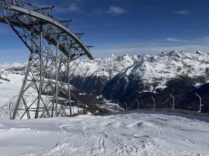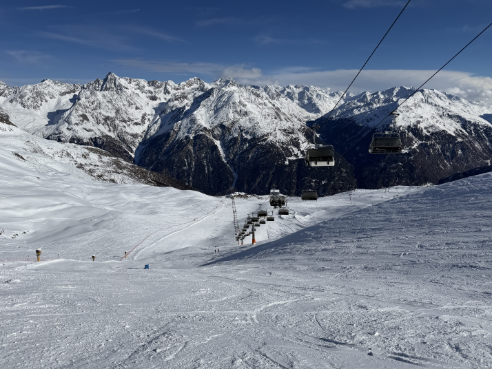 索尔登是一个单体雪场。什么意思?意思就是它不像之前的阿尔贝格(Arlberg)是几个分散的小雪场串联起来的,它本身是一座大山或和几座大山紧密挨着,缆车接驳更加方便,这样不折腾,在雪时间更长滑行效率更高。