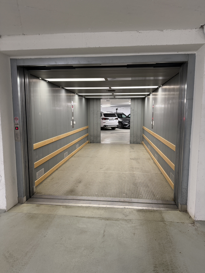 我们是先滑雪后入住,这边酒店的停车库,并不是直接开到地下的,而是坐一个大电梯升降下去。为什么?可能做通道太占地方了。我当时是有点懵逼的,居然还可以这么干。